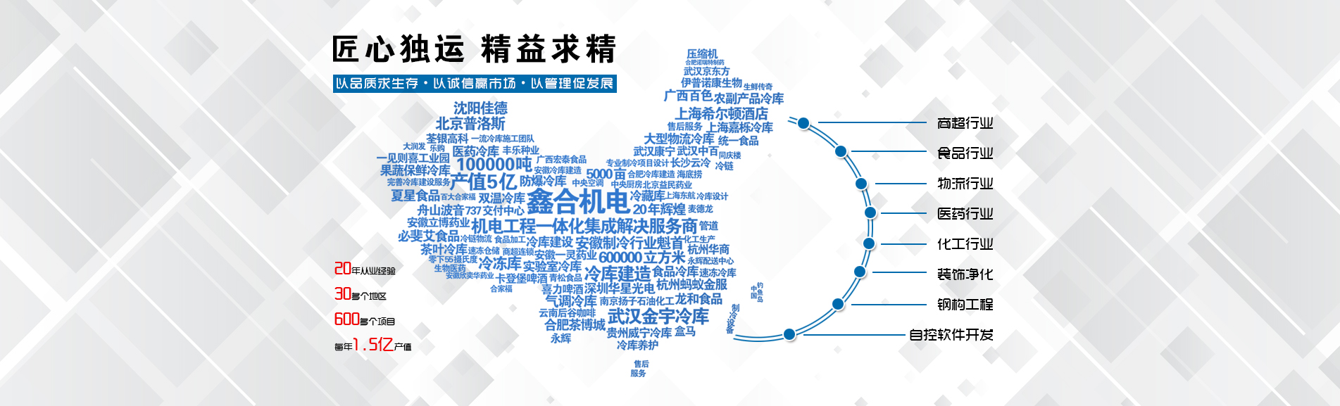 安徽鑫合機電設(shè)備有限公司于2002年組建運營,專業(yè)從事冷凍、冷藏庫、中央空調(diào)、醫(yī)藥凈化工程的規(guī)劃設(shè)計、施工承建、售后服務(wù)為一體的綜合性工程公司,與100多家實力雄厚的大中型企業(yè)建立長期產(chǎn)略合作關(guān)系,其中有多家世界500強和上市企業(yè)。公司作為中國倉儲與配送協(xié)會會員單位、安徽省制冷學(xué)會理事單位、上海楊浦區(qū)制冷協(xié)會工程總承包負責(zé)單位,引領(lǐng)于行業(yè)前沿。我們將銘記給予我們大力支持的各界新老朋友及合作伙伴,我們將會保持“互惠互利、共同發(fā)展”的原則與您共創(chuàng)雙嬴的合作關(guān)系。